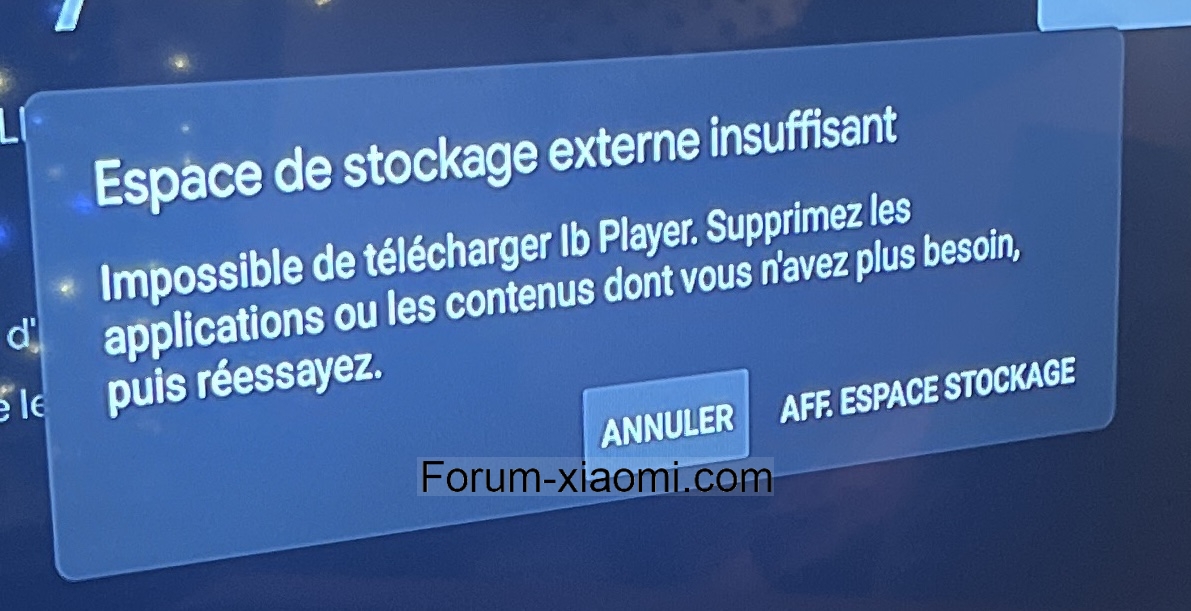 J’ai un problème avec la Xiaomi TV box S 2eme génération : lorsque j’essaie de télécharger une application, un message d’erreur « espace de stockage externe insuffisant » s’affiche, m’invitant à supprimer des applications alors même que je dispose d’espace de stockage suffisant (espace de stockage utilisé 762 Mo sur 4,6 Go) et que je ne peux supprimer aucune application car j’ai supprimé tout ce que j’avais auparavant installées… et que j’avais pourtant encore de l’espace de stockage disponible. J’ai tout essayé : vider les caches, supprimer les données, désactiver des applications, ajouter une clé usb comme stockage supplémentaire. Rien n’y fait, le même message s’affiche systématiquement. Est ce que quelqu’un a rencontré ce problème ? Comment faire ?
